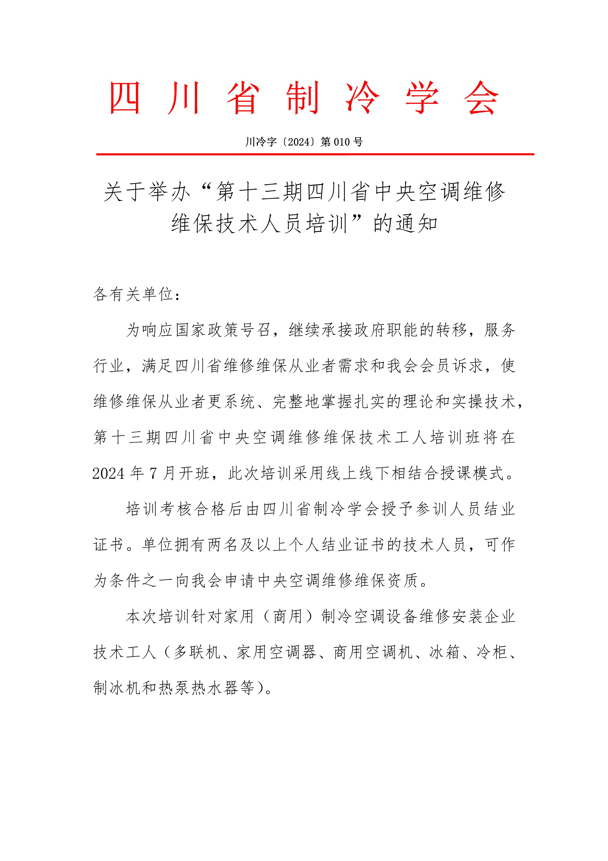 關于舉辦“第十三期四川省中央空調(diào)維修維保技術人員培訓”的通知