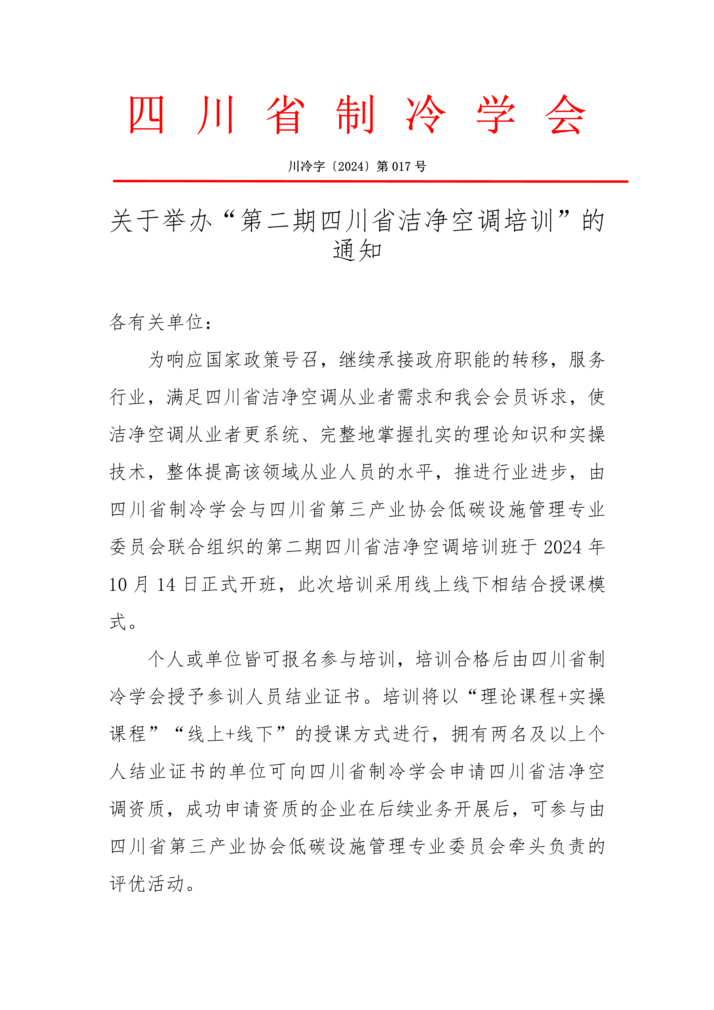 關(guān)于舉辦“第二期四川省潔凈空調(diào)培訓(xùn)”的通知
